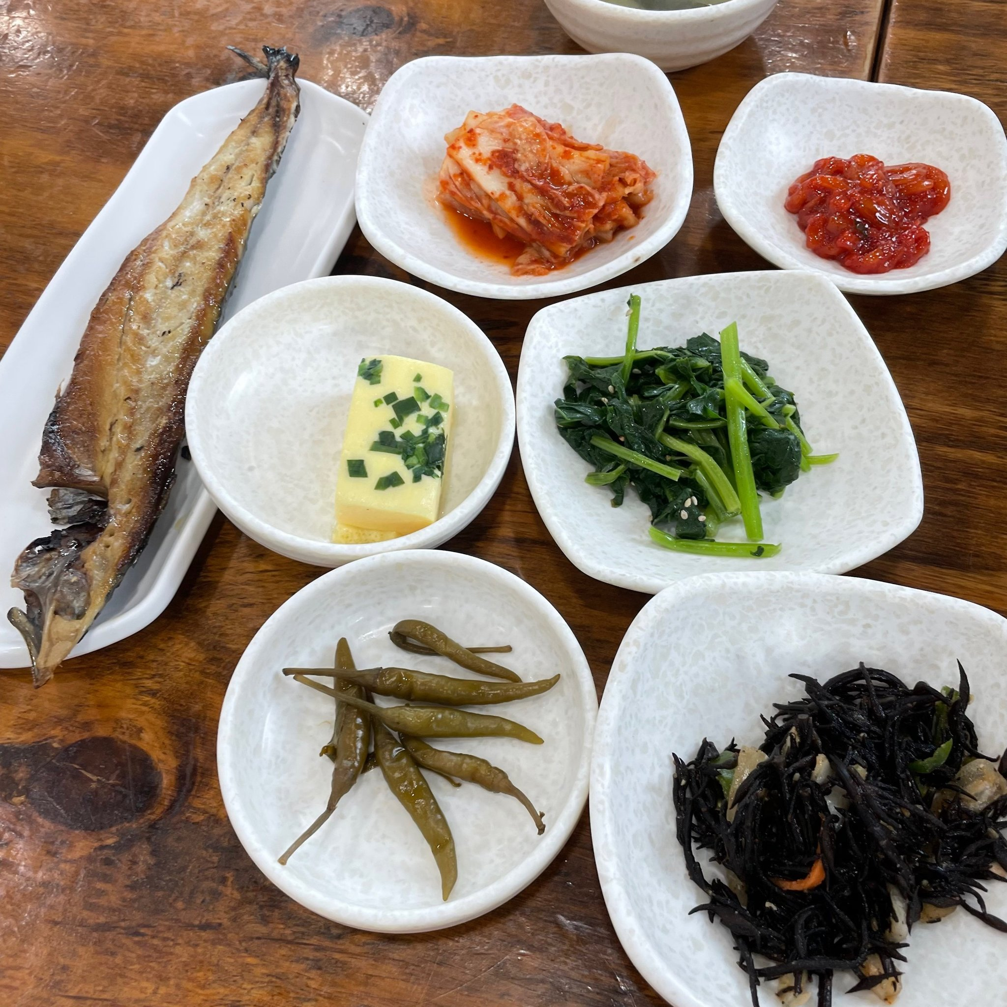 전복의 쫄깃함과 내장의 고소함 그리고 돌솥밥만의 서글거림까지 완벽한 밥이에요! 내장으로 밥을 지었다고 해서 비릴 거라 생각하고 (회, 해산물 잘 먹지만 비린건 못 먹음) 조금 꺼려졌어서 열자마자 바로 안 먹고 조금 식었을 때 맛을 봤는데 비린맛 비린 냄새는 전혀 나지 않고 일반 영양밥 냄새가 더 강해서 '이 돈 주고 전복돌솥밥을 먹는 게 맞나?' 의심하면서 밥을 덜어내어 한입 먹었더니 게딱지 고소함과는 또 다른 진한 전복 내장의 향이 느껴지더라고요. 그리고 참기름을 두르신 건지 엄청 고소했습니다. 그리고 기본찬으로 나오는 고등어도!! 엄청 맛있었어요! 왜 추가 메뉴에 있는지 알겠더라고요.